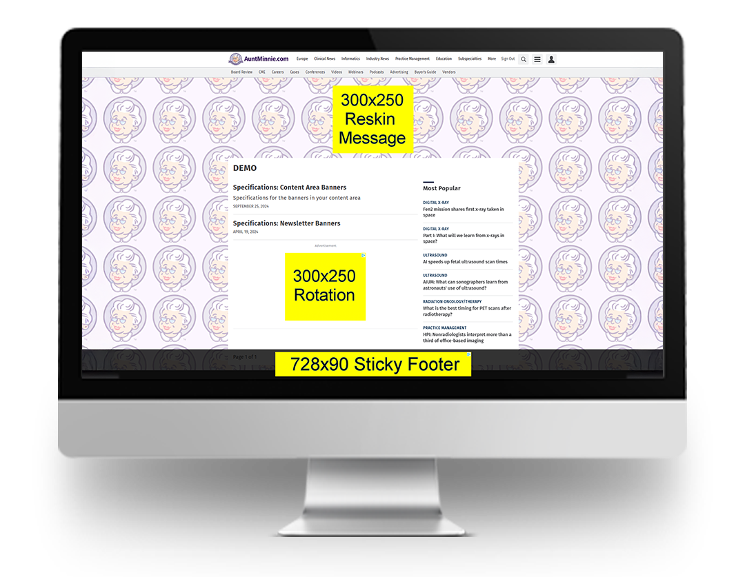 The run-of-site+ banners are displayed within the content block (300x250 Rotation), below the content block (728x90 for desktop sticky footer and 300x50 for mobile sticky footer), as well as the branded background (shown as the wallpaper with logos) and 300x250 reskin message box.