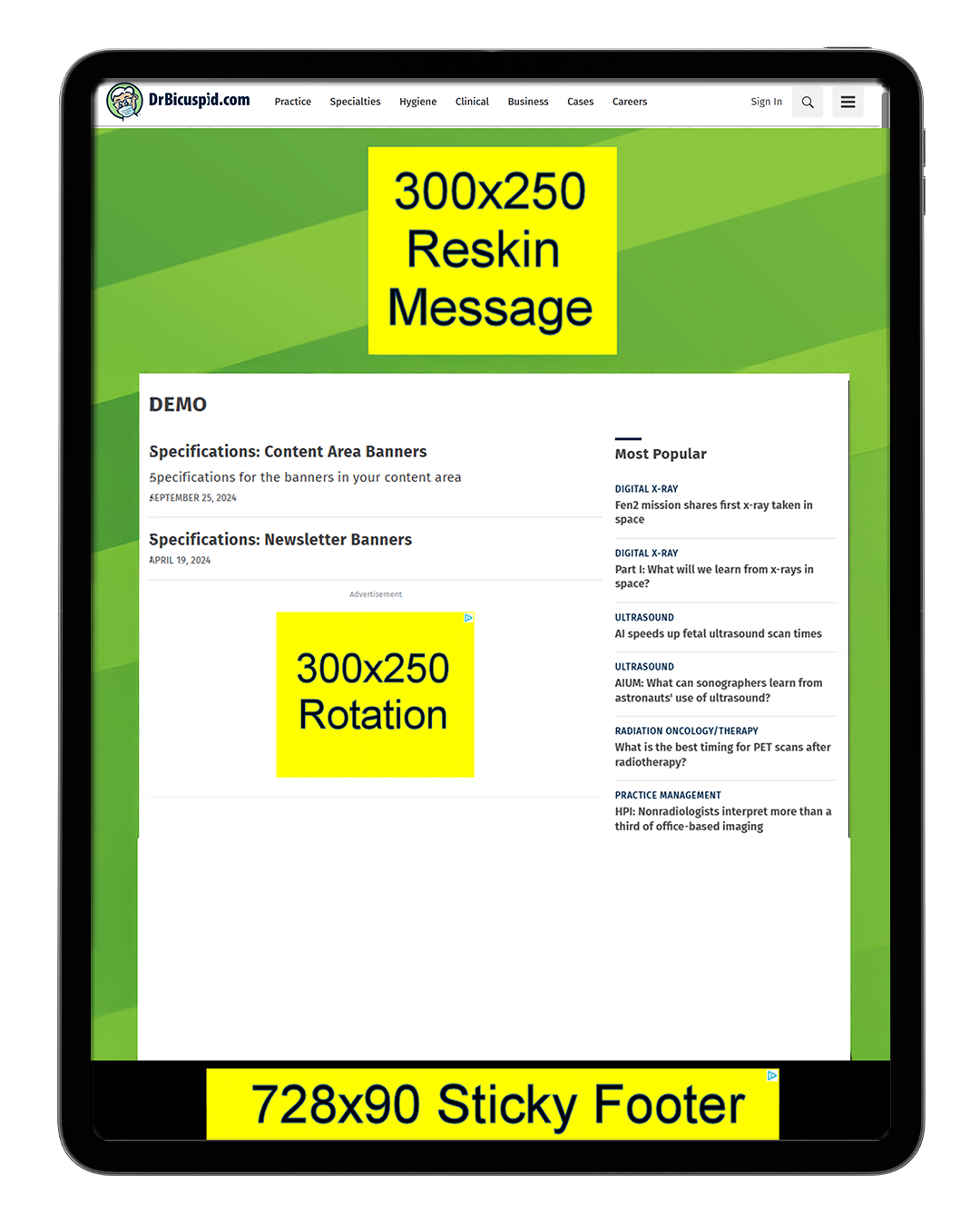 | Sticky Footer Desktop (728x90) | JPG, PNG, HTML5, or GIF (animation <15 sec) | Below content block |